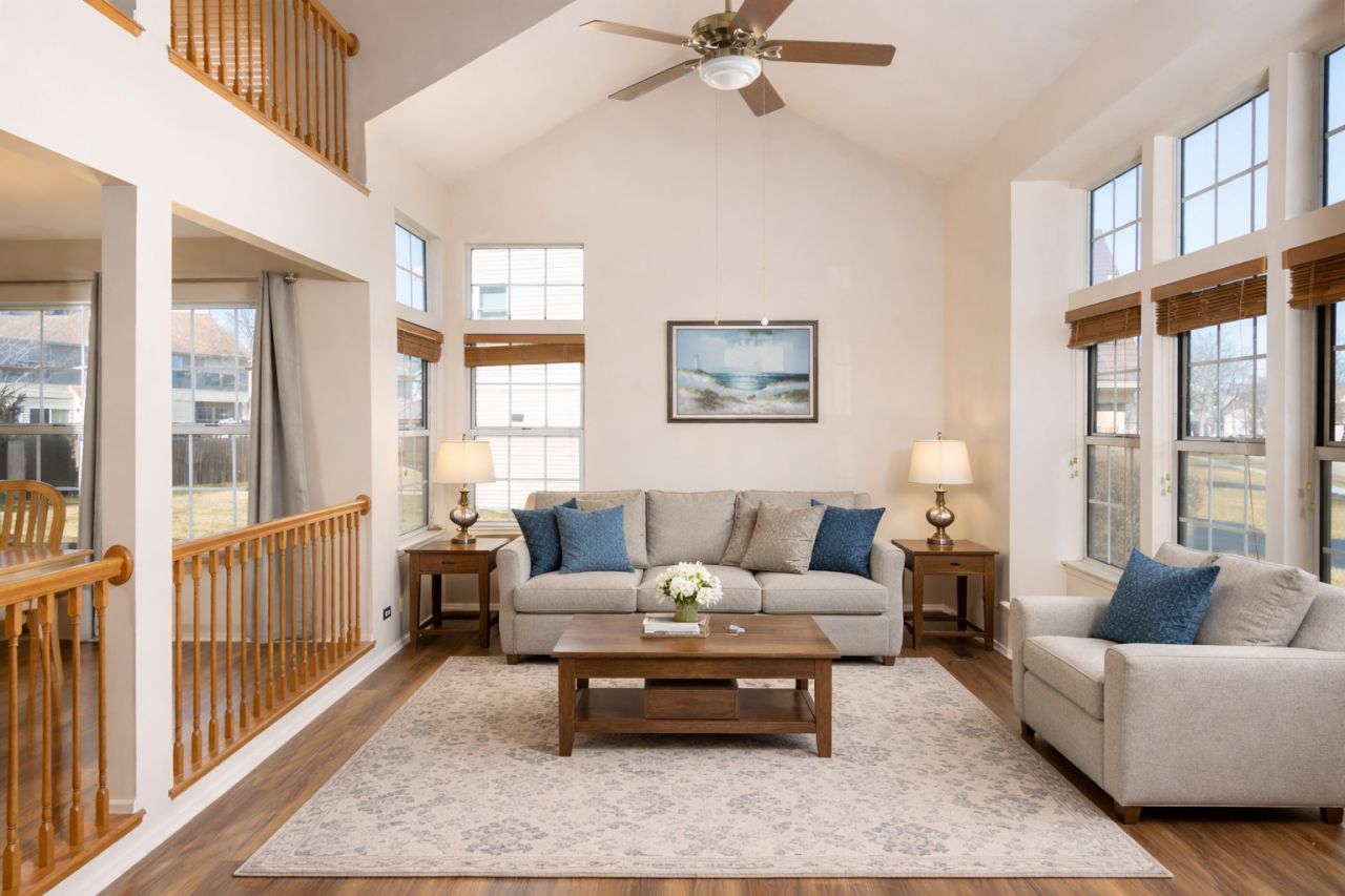 Never before listed home in the Villages Lake offering space, style, and an excellent location! This well-maintained 3 bedroom, 2.5 bathroom home features numerous recent updates including new flooring, updated fixtures, two brand-new tiled showers, and major mechanical improvements for peace of mind. The dramatic two-story living room fills the home with natural light and creates an open, airy feel. The spacious layout also includes a huge 25' x 13' loft that can easily be converted into a fourth bedroom, office, or flex space, providing excellent versatility for today's lifestyle. The unfinished basement is already plumbed for a future bathroom, offering great potential for additional living space. Enjoy outdoor living on the expansive 20' x 20' patio, perfect for entertaining or relaxing. Conveniently located close to shopping, restaurants, and parks, this home combines comfort, updates, and location all in one. The roof was replaced in 2011, AC and hot water heater was replaced in 2023. Don't miss the opportunity to own this move-in ready home with room to grow in a highly sought-after area of Crystal Lake!