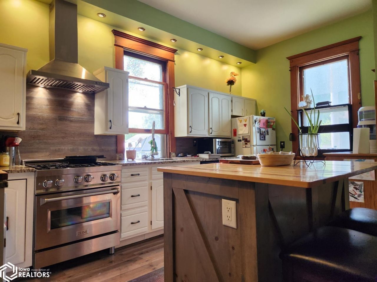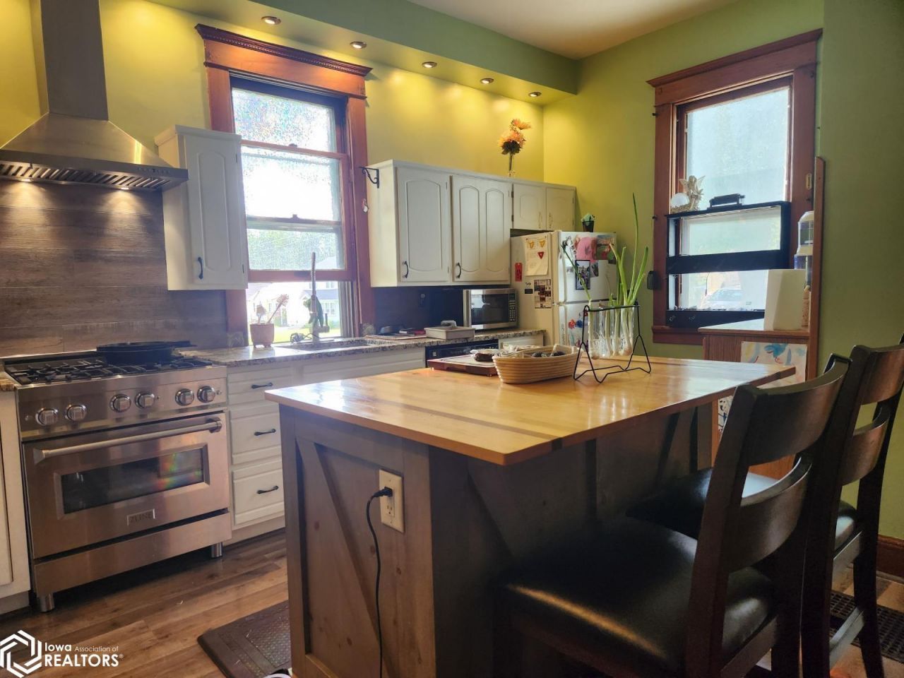 Tall windows and high ceilings give a feeling of spaciousness and grandeur, and lots of natural light. This classic 4 bedroom home has original wood trim and oak floors on main level. A large updated kitchen with custom built island of pine, maple and strips of walnut, stainless steel gas stove, tracking recessed lighting, custom built oak recycling station, and new floors. Dining room has an efficient Vermont Castings wood stove. The main level bathroom has a large soaking tub. Original charm includes solid doors with beveled glass and sliding pocket doors. Three separate porches/entrances lead out to the yard, play structure, and detached garage. Conveniently located near high school and a short walk to the town square and cafes. Don't miss the reading nook on the second floor.