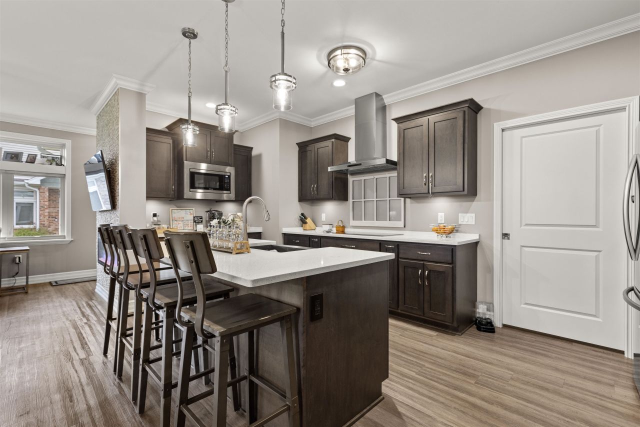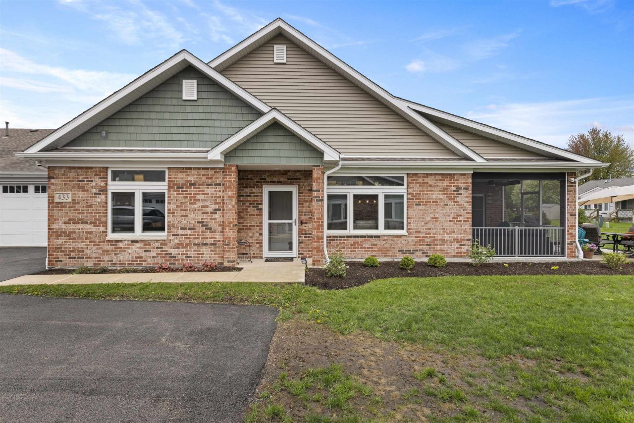 Experience elevated luxury in this stunning custom-designed condo suited for those 55 and better. Every thoughtful detail has been taken care of, just move in and enjoy! As you enter, notice transom windows, French doors that lead into the office, crown molding, and a fireplace feature wall. The kitchen is well appointed with upgraded Barkur custom cabinetry offering many useful details such as a pull-out spice cabinet and drawer inserts. Quartz counters, double ovens, beverage refrigerator, recirculating hot water, and a walk-in pantry are just some of a vast list of notable kitchen amenities. The Primary Retreat is a dream come true with illuminated tray ceiling and picture molding, no detail is spared. Offering a spa-like experience with a soaker tub, massive no-step shower, and a walk-in closet. You'll find a second bedroom and full bathroom tucked away for privacy. Off the main living area is a perfectly sized sun room with massive windows. Beyond that you'll appreciate the screened-in patio with an additional 11x12 uncovered patio. In the 3 car garage you'll see 2 parking spaces and a finished tandem area for storage. Up the stairs you'll find an additional finished space perfect for a rec room, storage, exercise equipment, or studio. Fee includes common insurance, exterior maintenance, lawn care, snow removal, Spectrum internet and streaming, pickleball courts and clubhouse access. See complete list of upgrades in documents.