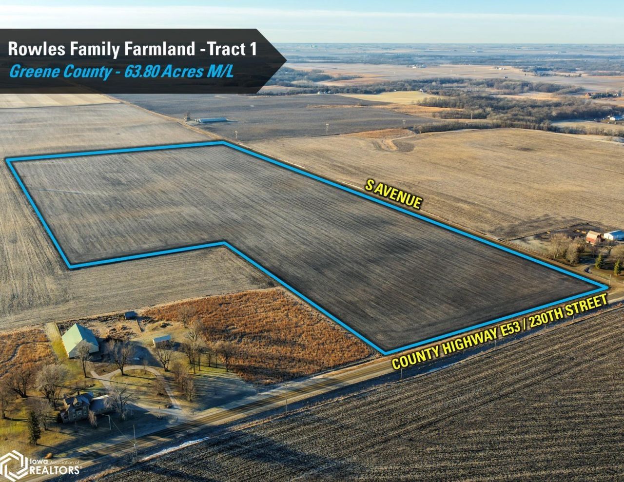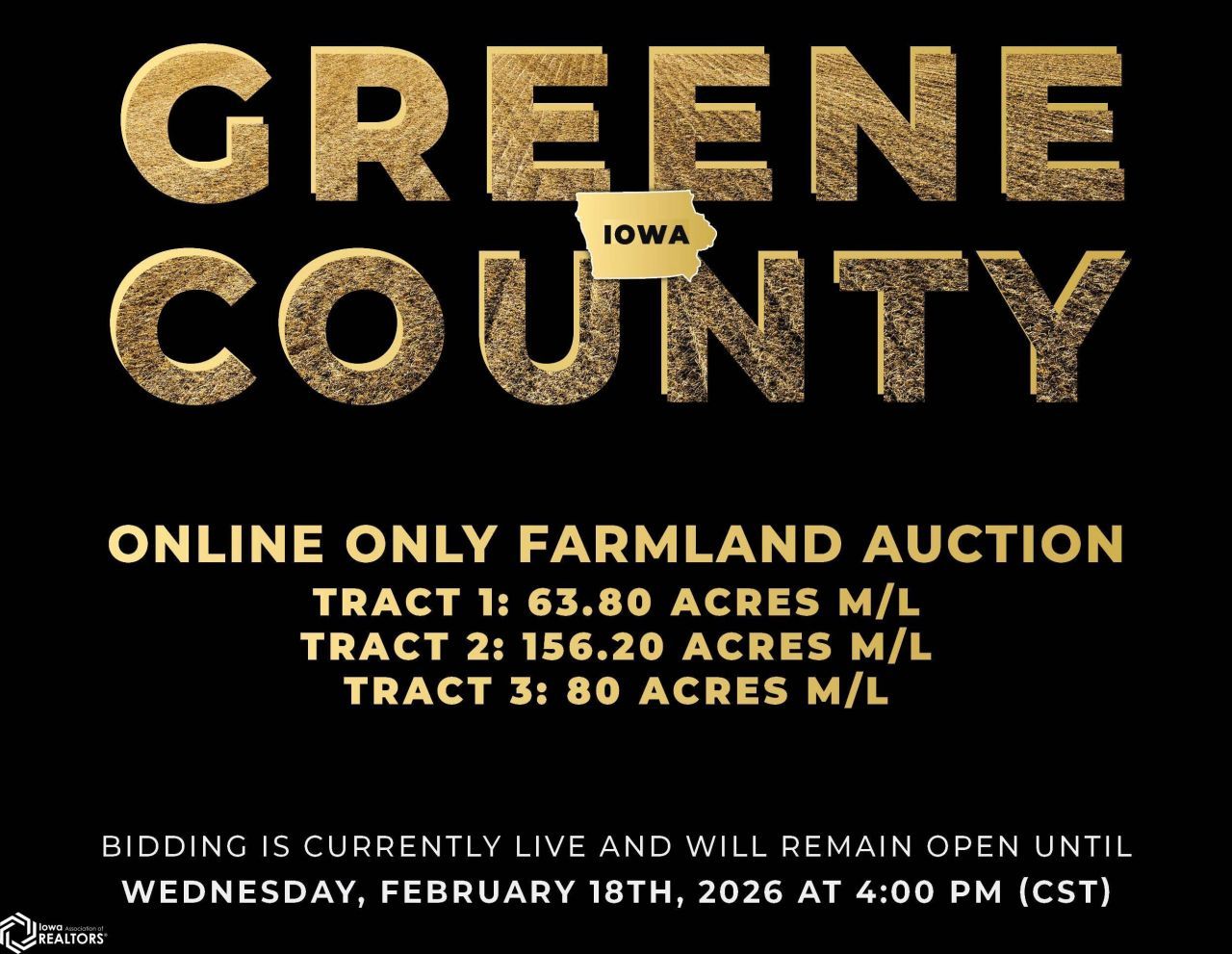 Greene County, Iowa Online Only Farmland Auction - Wednesday February 18th, 2026! I'm pleased to be representing the Rowles Family in the sale their family's 300 acres m/l. Offered as three individual tracts, these farms are located northwest and southwest of Grand Junction, Iowa in Sections 7, 20, and 29 of Junction Township, Greene County, Iowa. Tract sizes range from 63.80 acres to 156.20 acres and would make for great add-on tracts to an existing farming operation or an investment for the Buyer looking to diversify their portfolio or hedge inflation. Tract 1: 63.80 acres m/l with 62.12 FSA cropland acres and a CSR2 soil rating of 78.7 Tract 2: 156.20 acres m/l an estimated 149.55 FSA cropland acres and a CSR2 soil rating of 61 Tract 3: 80 acres m/l with 79.35 FSA cropland acres currently enrolled in the Conservation Reserve Program (CRP) with an annual payment of $18,340 These tracts are located in a strong farming community with several grain marketing options located nearby, including the Louis Dreyfus ethanol plant located within four miles of each tract. The farms are leased for the 2026 growing season and the Buyer(s) will receive the 2026 rent payments. The payments will be made this spring after closing and on September 1, 2026. Yield history is available upon request, contact the listing agent for more information. The farms lie on or near paved roads. Visit our website for more information regarding this 3 tract Auction.
